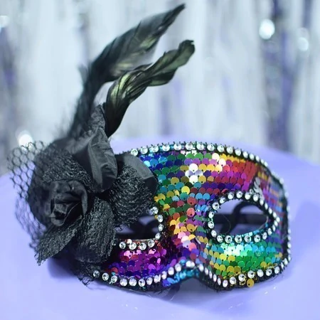 ANTIFAZ RECUBIERTO DE LENTEJUELAS REVERSIBLES MULTICOLOR, CON FLOR Y PLUMAS EN NEGRO