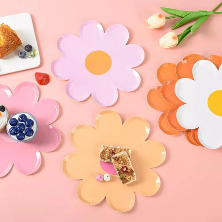 PLATOS DE COLORES CON FORMA DE MARGARITA. MATERIAL: POLIPAPEL. VIENEN 10 UNIDADES.