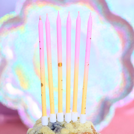 Set de 6 velas de cera con diseño degradé y detalles dorados. Ideales para decoración de eventos, centros de mesa y repostería.