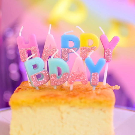 Velas en colores pastel con glitter metalizado, formando la frase HAPPY BIRTHDAY. Cada letra mide 3 cm, ideal para ventas mayoristas en cumpleaños y eventos.