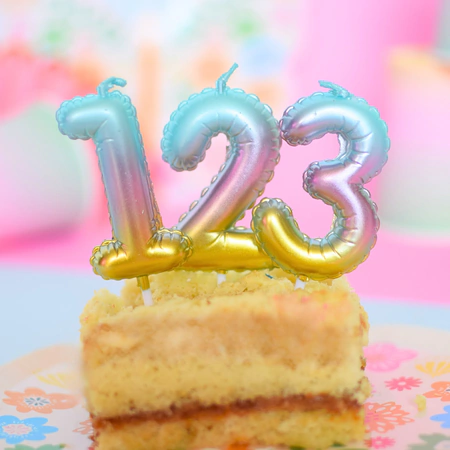 Pack de 12 velas de cera en forma de número, diseño globo con efecto degradé pastel multicolor. Perfectas para decorar tortas y mesas en cumpleaños, aniversarios y celebraciones especiales.