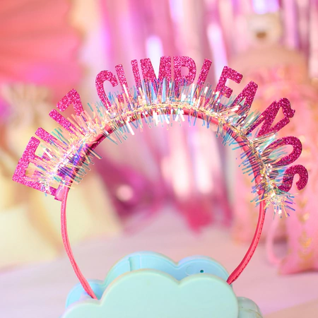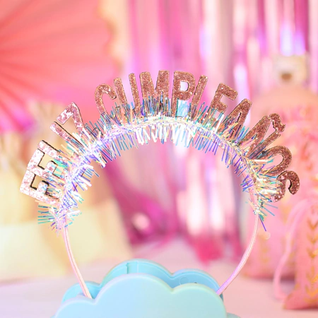 VINCHA CON LA FRASE "FELIZ CUMPLEAÑOS" EN GLITTER Y FLECOS IRIDISCENTE.PACKAGING: BOLSITA TRANSPARENTE.