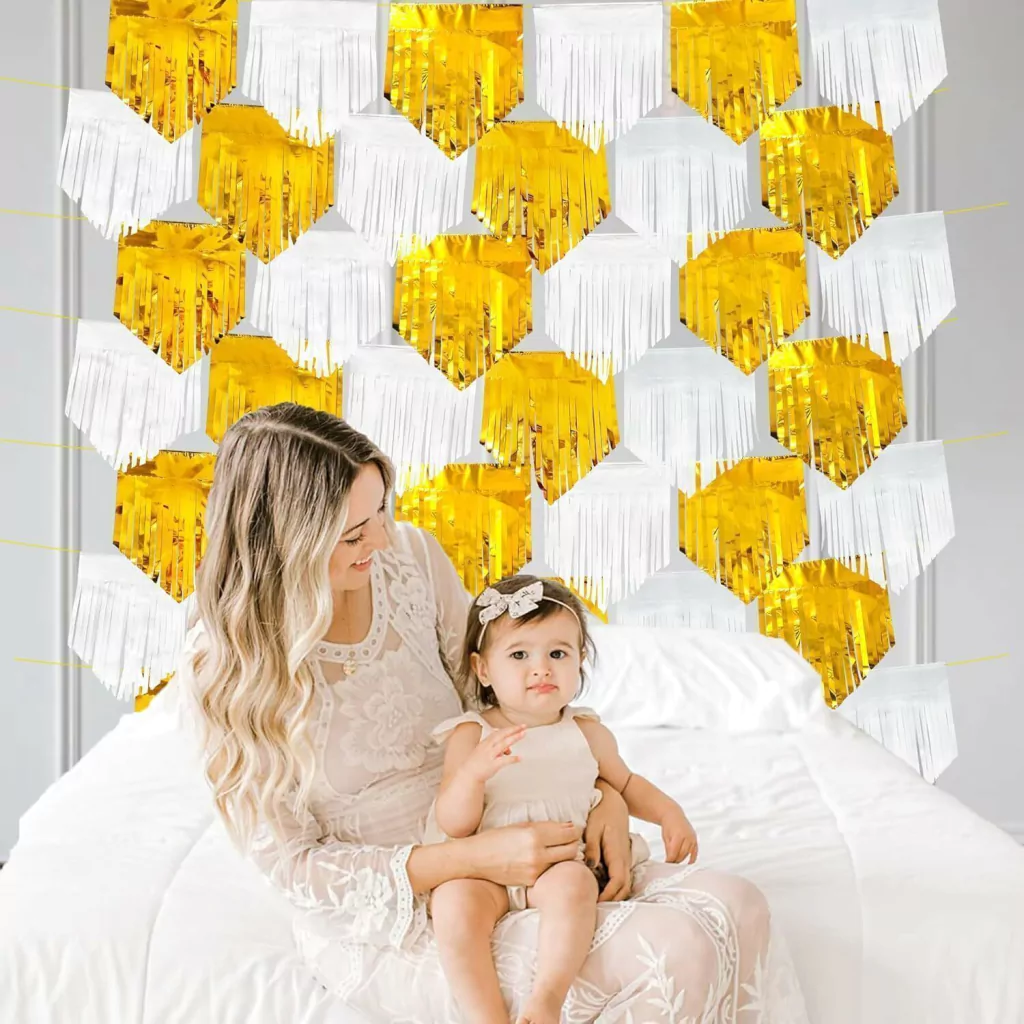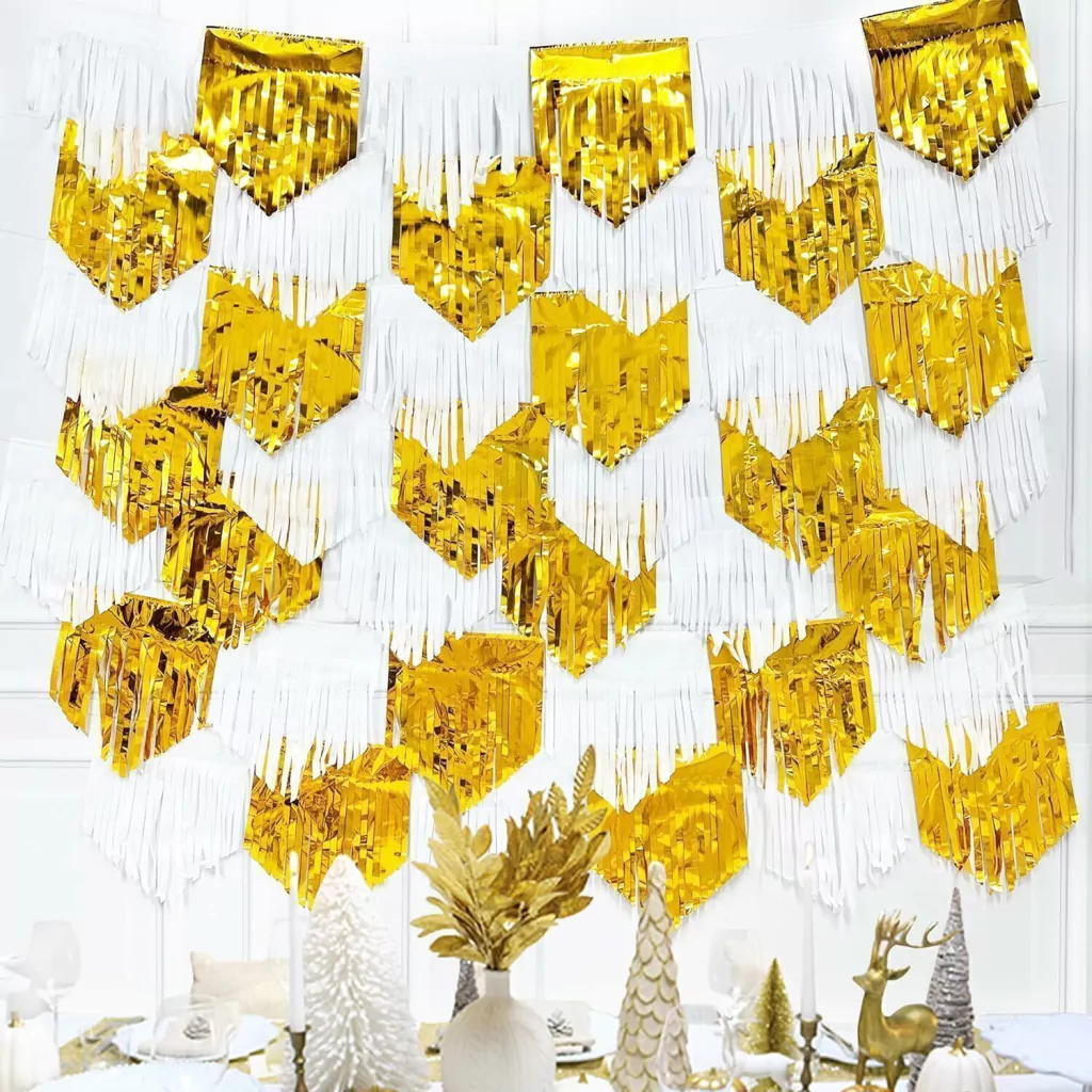 VIENEN 4 TIRAS DE 6 TRIÁNGULOS CADA UNA POR PAQUETE. GUIRNALDA CON FLECOS DE PAPEL METALIZADO Y PAPEL BARRILETE PARA FORMAR FONDO DE DECO TIPO PINTEREST.