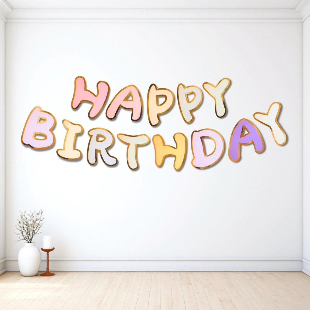 BANDERÍ CON FRASE "HAPPY BIRTHDAY" CON LETRAS DE COLORES. CADA LETRA TIENE EL BORDE EN STAMPING COLOR DORADO.