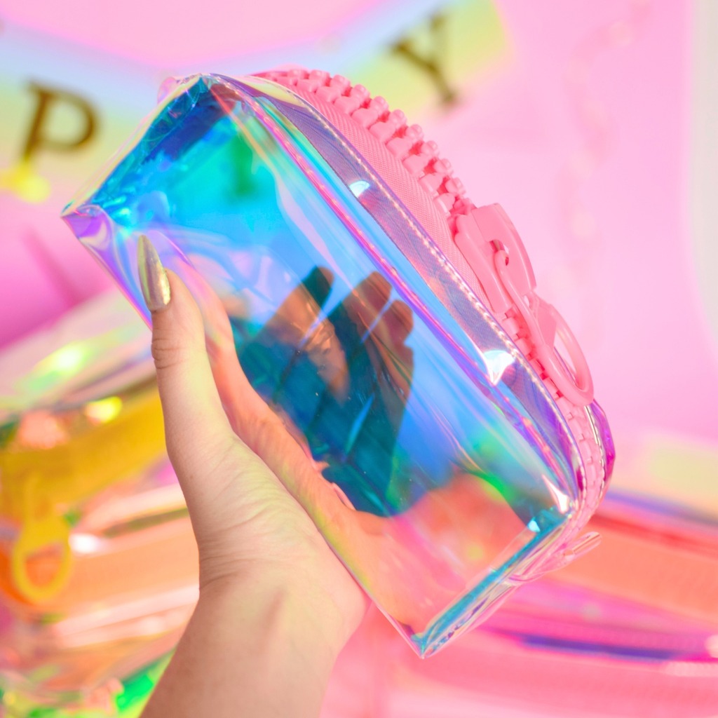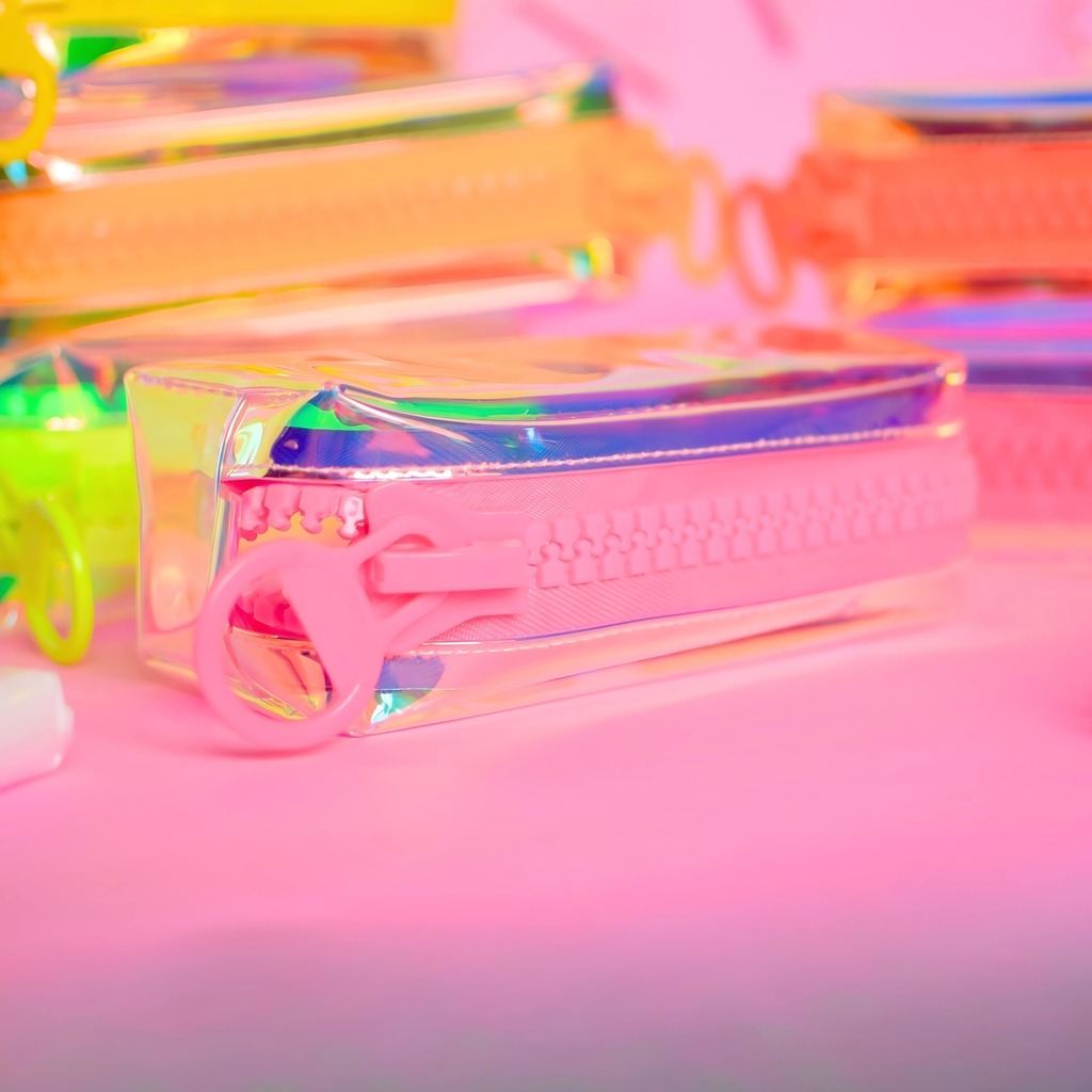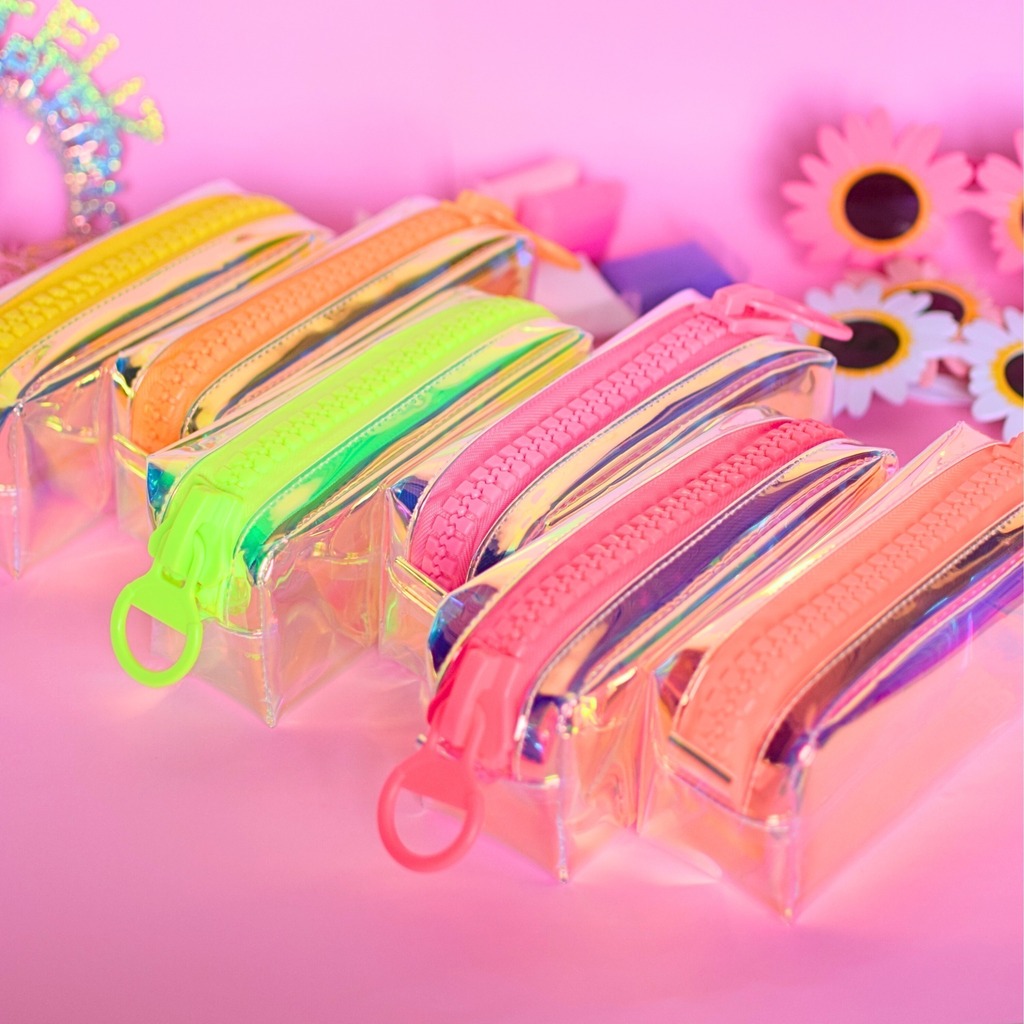 CARTUCHERA DE VINILO TRANSPARENTE IRIDISCENTE CON CIERRE XL EN DIFERENTES COLORES. 20CM DE LARGO X 7CM DE ANCHO