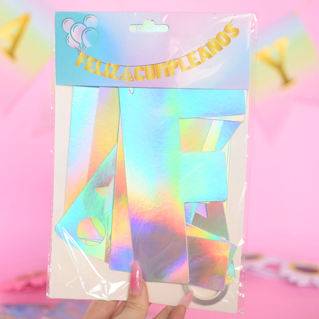 BANDERÍN FRASE "FELIZ CUMPLEAÑOS" EN COLORES METALIZADOS O IRIDISCENTE