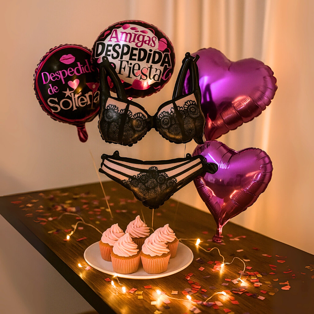 🎈 Set de Globos Eróticos "DESPEDIDA DE SOLTERA": Incluye 2 globos con frases divertidas, 2 globos estrella/corazón y 1 globo 4D. Perfecto para comerciantes que buscan animar despedidas con humor y estilo.