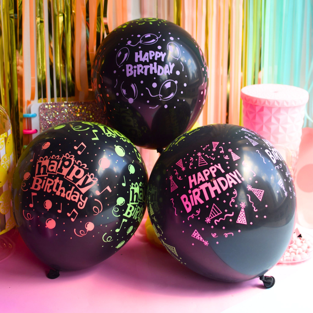 Globos de Látex Flúo "Happy Birthday" x10 Unidades Pack ideal para comerciantes: 10 globos flúo estampados, aptos para helio y aire. Presentación colgable, lista para exhibir y vender.