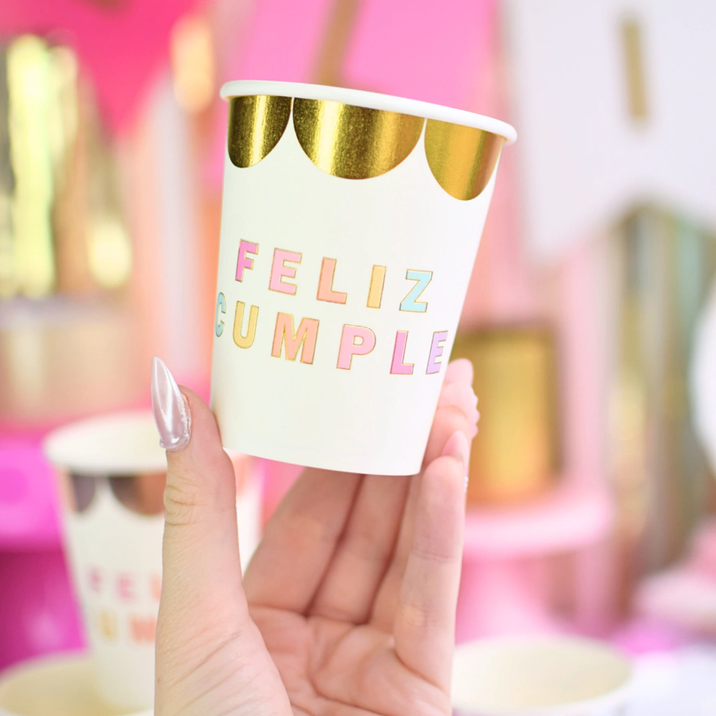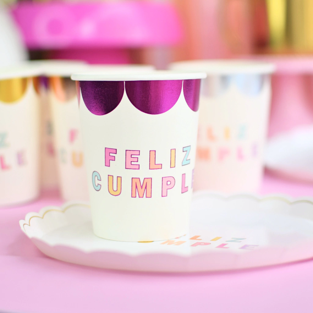 Vasos multicolor metalizados "Feliz Cumple".Pack x10.Material: polipapel.Uso: eventos, cotillón, reventa.
