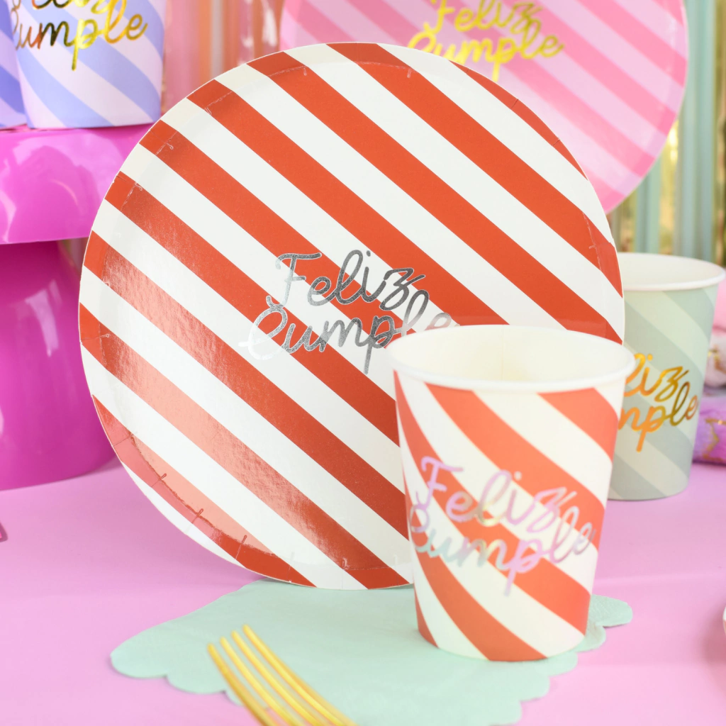 Pack x10 vasos descartables de polipapel, diseño rayas “Feliz Cumple”.Aptos para bebidas frías/calientes.Ideal para negocios de cotillón, eventos y reventa.Prácticos, resistentes y de fácil almacenamiento.