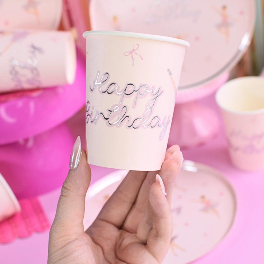 Pack x10 vasos descartables de polipapel. Diseño "Happy Birthday" Ballet. Ideal para comercios de cotillón, eventos y reventa. Prácticos y fáciles de almacenar.